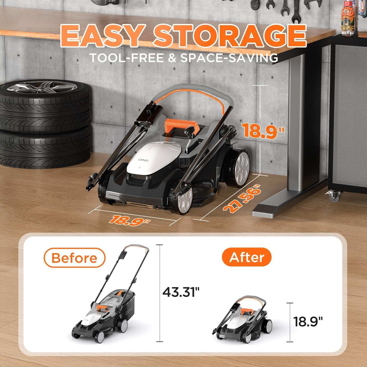 Height Adjustment: 6-position height adjustment for versatility in all environments, plus a 50% increase in grass collection efficiency.Convenient Storage: Foldable handle for easy vertical storage, saving space, with a 40L grass bag for quick and easy disposal.Maintenance-Free: No gas, no oil, no emissions. Starts instantly, operates quietly, and delivers the power you need.