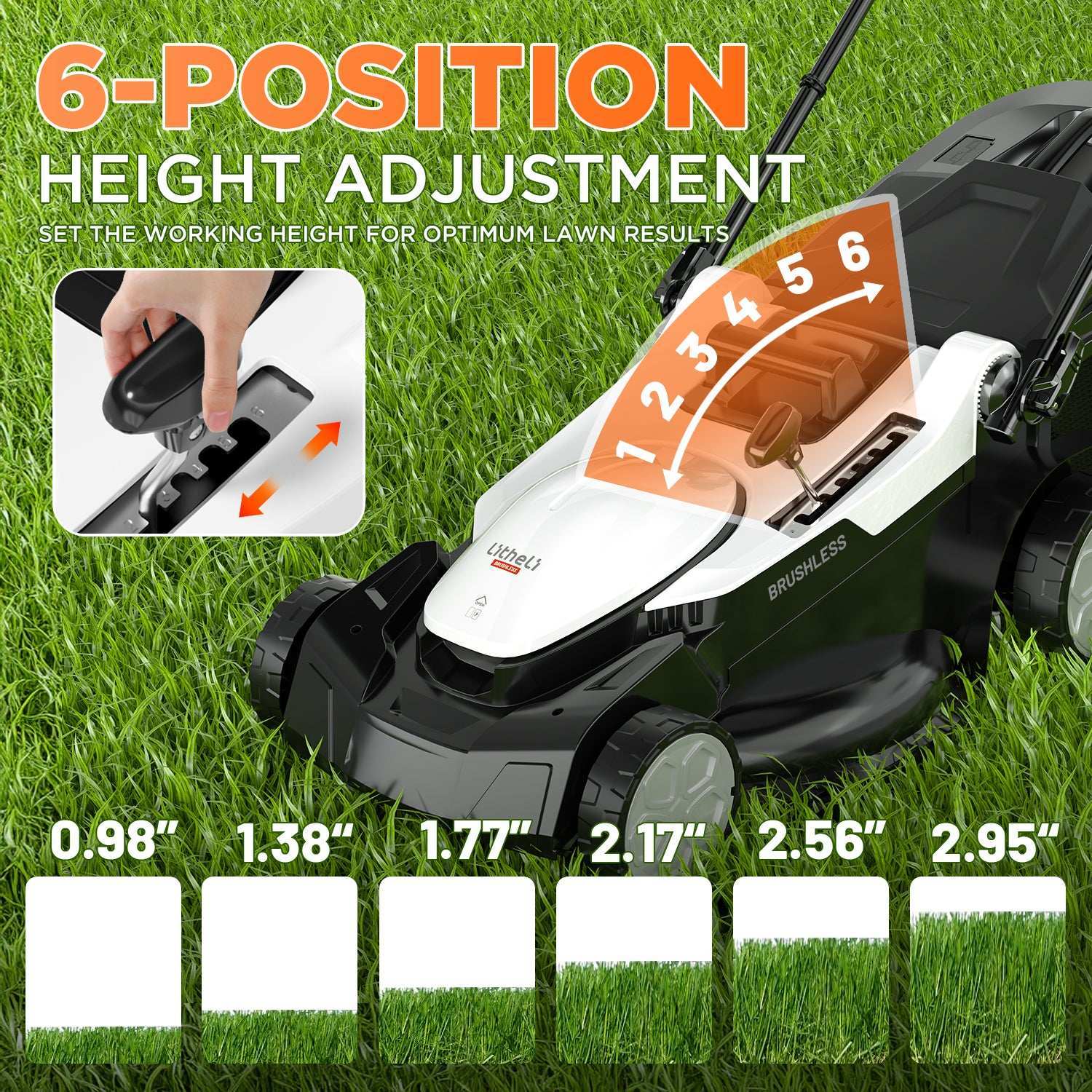 6-Height Adjust: The cordless lawn mower with 6 position height adjustment from 0.98 inches to 2.95 inches. This flexibility accommodates various grass types and seasonal needs, ensuring a perfectly manicured lawn year-round.